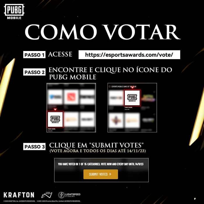 O PUBG MOBILE foi indicado a duas categorias do renomado Esports Awards 2023. Dedicado a mostrar o melhor desempenho e inovação de jogadores, equipes, mídia, fornecedores de hardware, jogos, eventos e personalidades do cenário competitivo, o Esports Awards é uma premiação concorrida e reconhecida no mundo todo.As categorias indicadas de PUBG MOBILE são: Jogo de Esports do Ano e Jogo Mobile de Esports do Ano. Vote aqui até 14 de novembro. A cerimônia de premiação será realizada nos dias 29 e 30 de novembro, em Las Vegas, nos Estados Unidos.Na edição passada o PUBG MOBILE venceu na categoria de Jogo Mobile de Esports do Ano, graças ao apoio dos jogadores. Contamos com o seu voto para que o nosso battle royale seja o número um novamente!PUBG MOBILE pode ser baixado gratuitamente na App Store e Google Play Store.